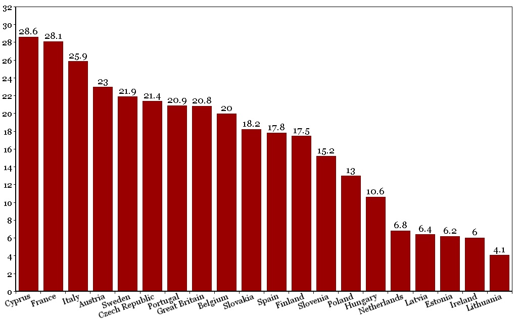 Highest effective corporate income tax rate is in Cyprus, France, Italy, Austria- states that wants common minimum effective corporate tax rate in Union. Lowest effective tax rates are in Lithuania, Estonia, Ireland and Latvia.